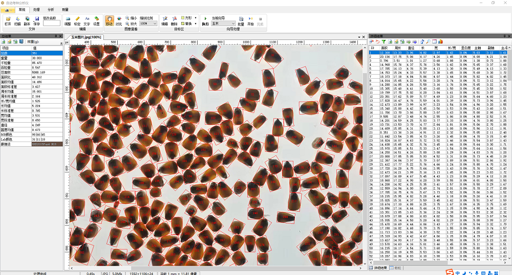 5、能自動測出各類粘連種粒的每粒粒形參數(shù)(長、寬、長寬比、面積、等效直徑、周長等),能精準(zhǔn)顯示種粒外接矩形,并可自動排序輸出,及可輸出粒徑分布圖表。